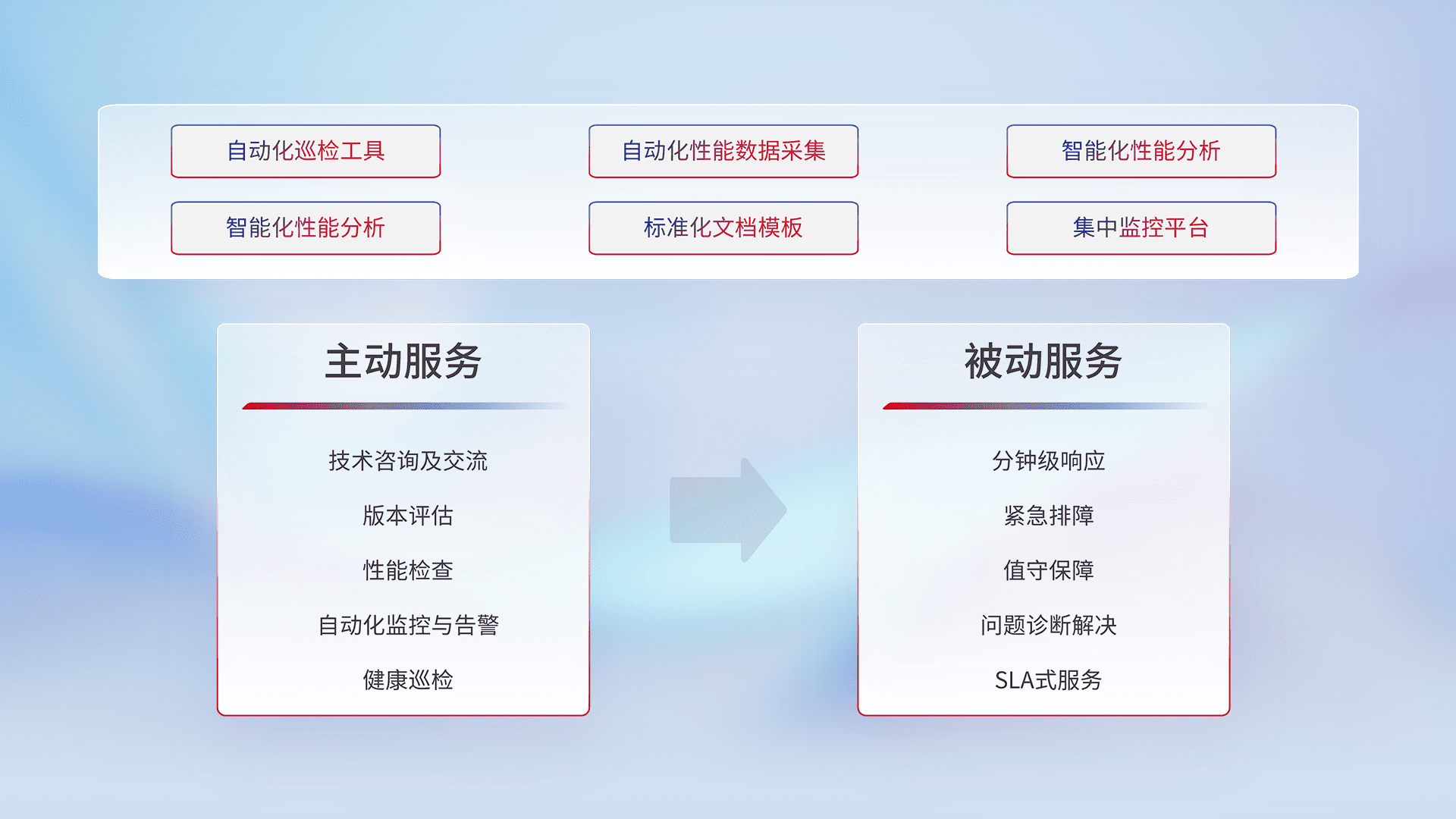 智能化工具和标准化文档,,,保障服务质量,,,,提供主动服务(包含技术咨询、、、版本评估、、性能检查、、自动化监控与告警、、、、健康巡检)和被动服务包含(分钟级响应、、、、紧急排障、、值守保障、、、、问题诊断解决、、、、SLA服务)。。。。